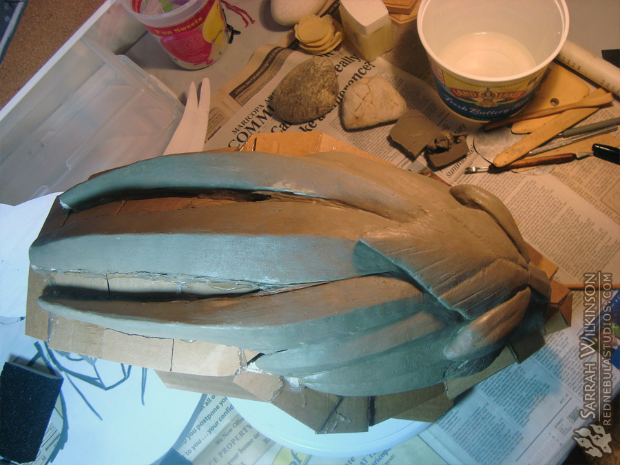 Before molding, the whole sculpture gets a coating of Krylon Crystal Clear gloss spray. This helps with cleaning out the mold later on. It also protects the sculpture from minor damage during the molding process. Since oil-based clay never hardens, you have to be careful not to damage or deform it while the mold is being created!