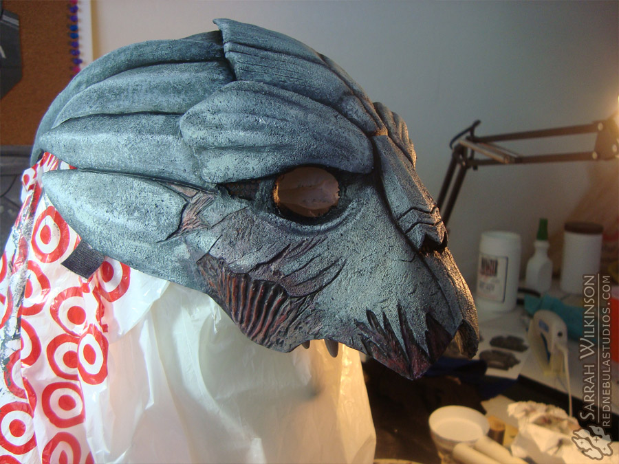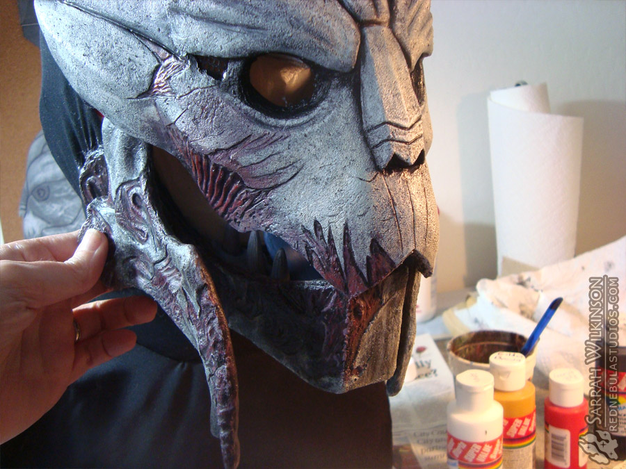 Here's a side view of the mostly finished base coat. Again, notice how the details are emphasized - the peaks of each crest, the edges around the fringe and brow plates, the sculpted grooves and facial scars. Take photos as you paint, with and without a flash. This'll help you judge how your costume will look when you take it around at shows.