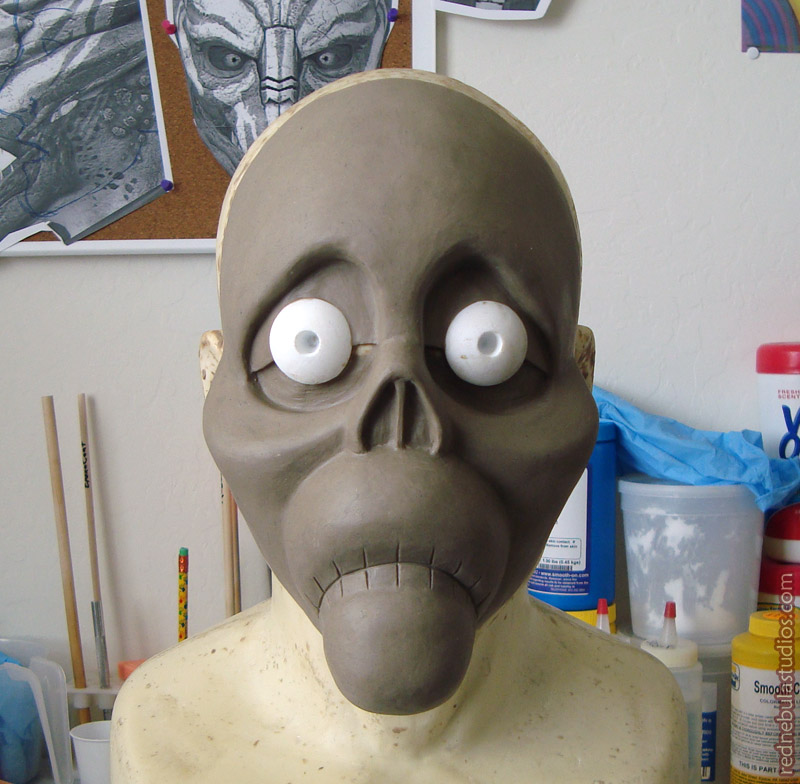 Here's the same technique used on the eyes for the Sad Grim Reaper mask commission, crafting a single dome in clay with a pit in the center, and then molding and casting it so that both eyes would be precisely the same size and shape. |